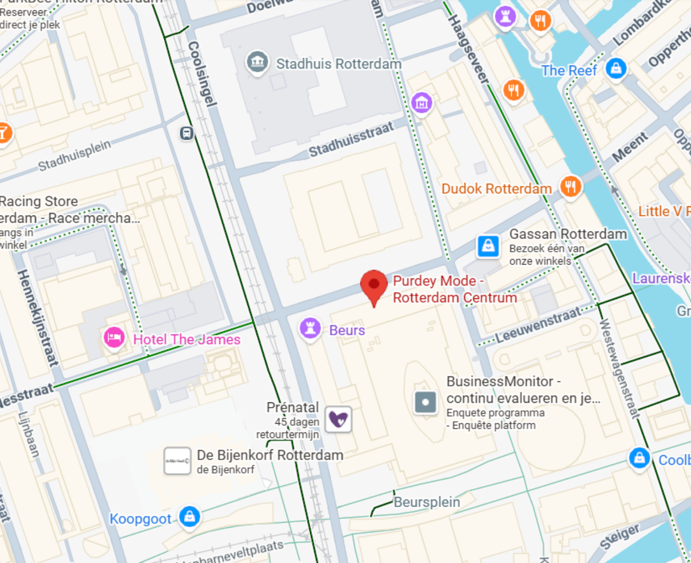 Aan de levendige Meent, een van de meest karakteristieke straten van Rotterdam Centrum, vindt u Purdey. Deze locatie ademt stads energie en stijl en vormt het perfecte decor voor een collectie die tijdloze elegantie combineert met een moderne uitstraling. Purdey aan de Meent is er voor vrouwen die houden van kwaliteit, comfort en een verzorgde look met een eigentijdse twist.