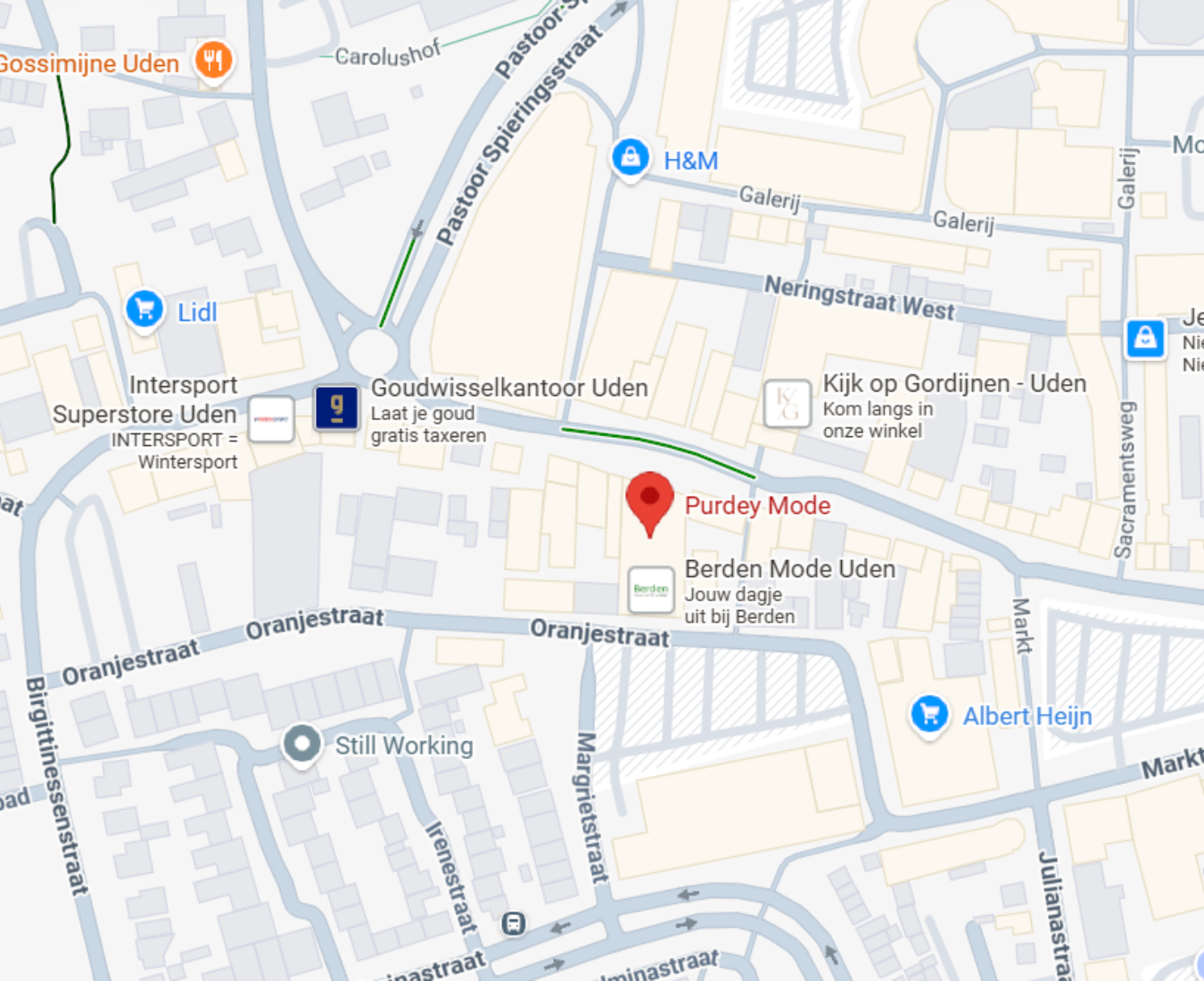 In het Berden Warenhuis, aan de Marktstraat in Uden, vindt u Purdey. Deze locatie biedt een prettige en overzichtelijke winkelomgeving waar kwaliteit, service en tijdloze mode centraal staan. De collectie van Purdey sluit naadloos aan bij vrouwen die kiezen voor een verzorgde uitstraling en duurzame kleding die seizoen na seizoen mooi blijft.
