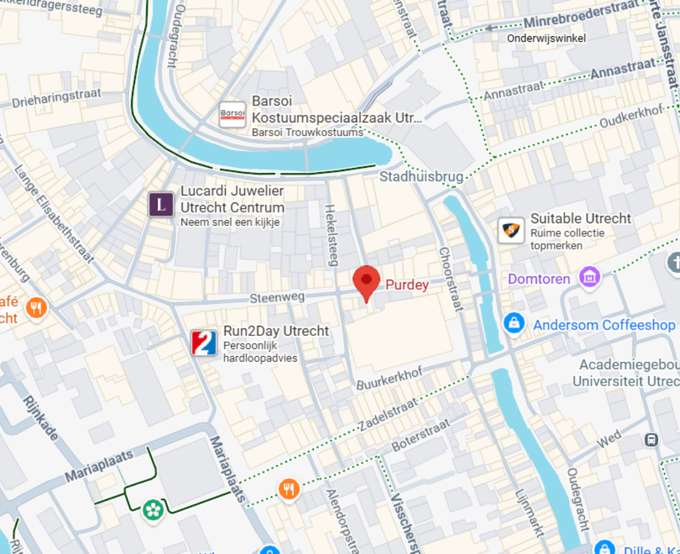Een bezoek aan Purdey laat zich perfect combineren met een dagje Utrecht. Op loopafstand liggen de Oudegracht, de Domtoren en talloze gezellige cafés en boetieks. Zo wordt winkelen bij Purdey onderdeel van een complete en inspirerende stadsbeleving.
