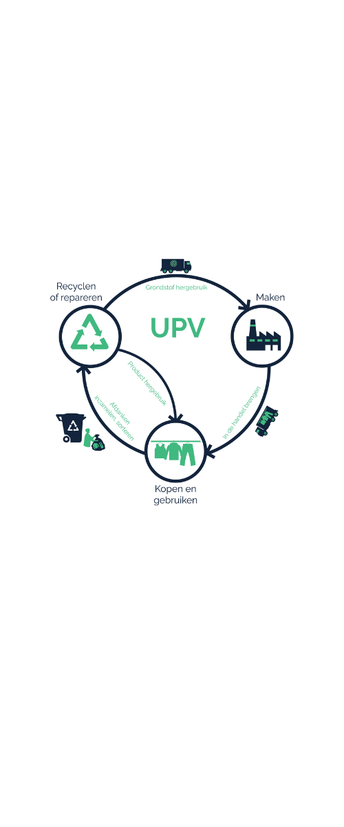 Samen met de stichting UPV dragen we zorg voor het inzamelen en recyclen van kleding die niet meer gebruikt wordt. Zo verminderen we de druk op het milieu en werken we toe naar een circulaire keten.